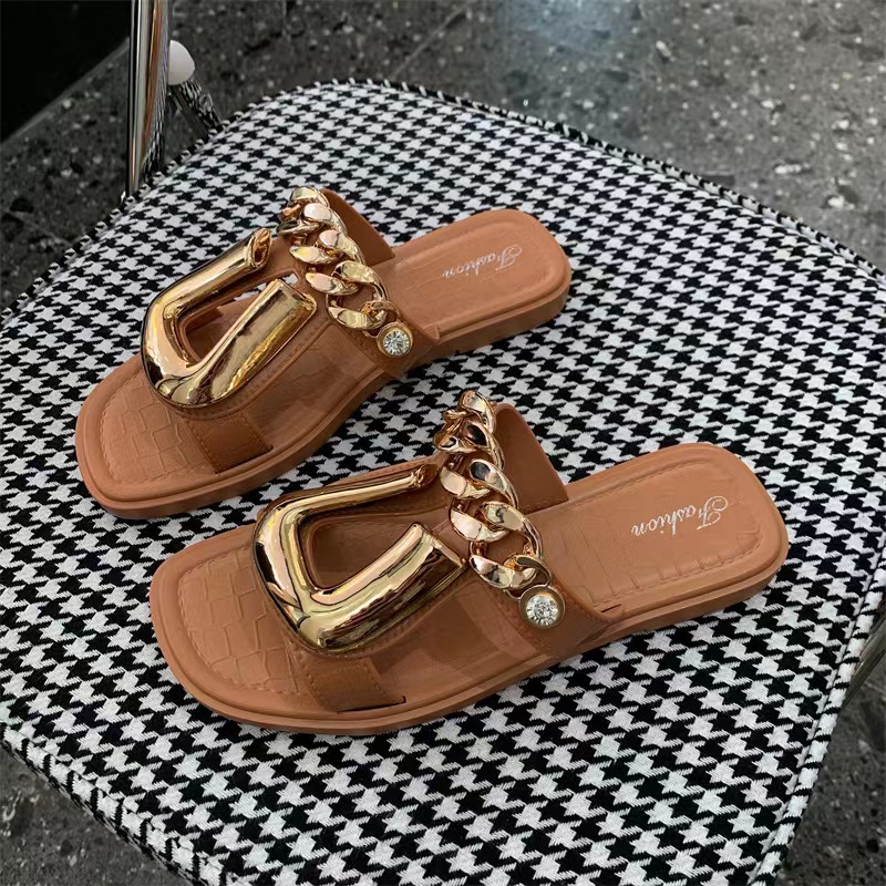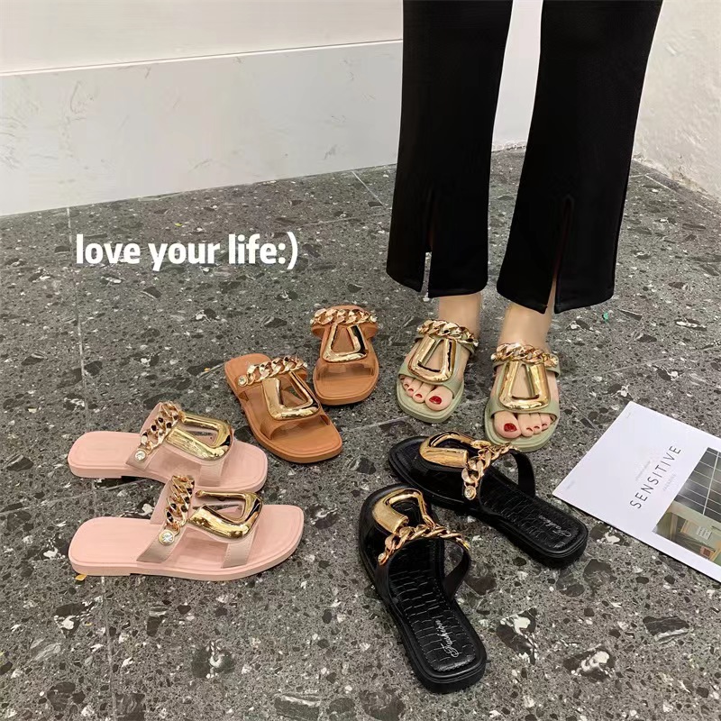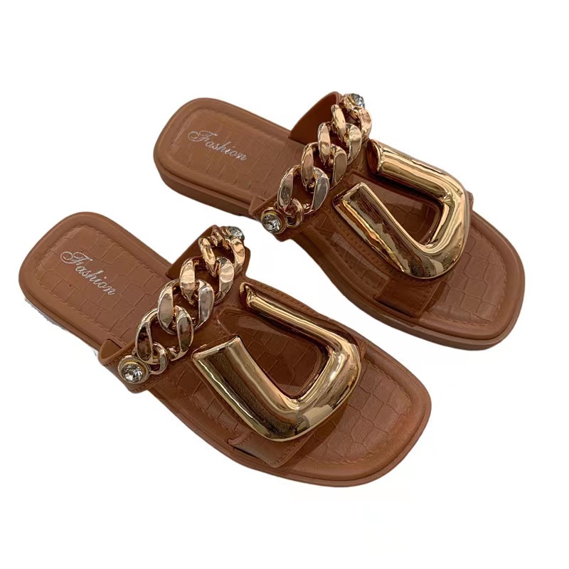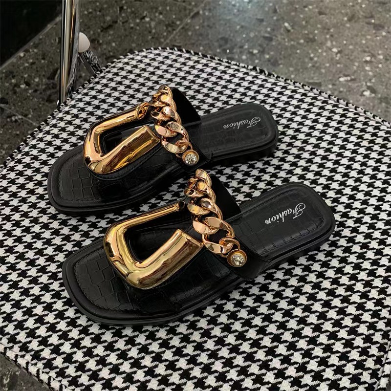 2022 new style personality chain U on slippers female fashion square head wear female slippers wholesale